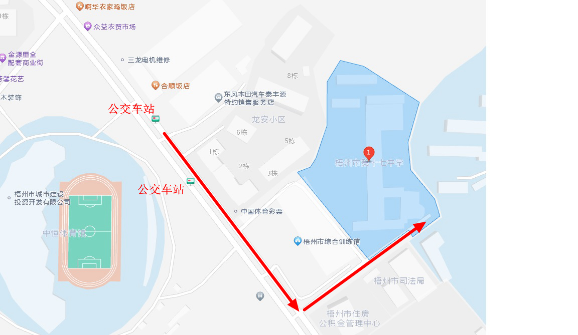 公交車參考:10路、32路、49路、49路延長線、蒼梧城鄉6路。進入梧州學院校區統一在東大門進入,考點門口處于交通干道,送考車輛只能在東門外短暫停留,南門及其他門不得進入無法核驗考生身份。