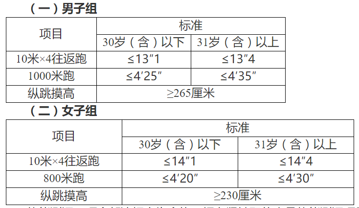 體能測評三項全部達標方為合格。報考緊缺職位人員體能測評項目三項中有兩項達標的,視為合格。體能測評項目中,縱跳摸高項目的測評次數不超過3次,10米×4往返跑項目的測評次數不超過2次,男子1000米跑、女子800米跑項目的測評次數為1次。