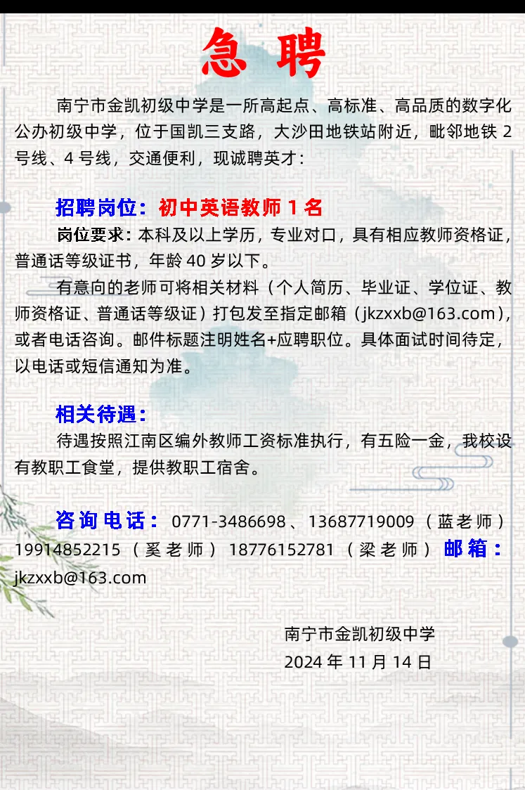 2024年南寧市金凱初級(jí)中學(xué)招聘英語教師1人