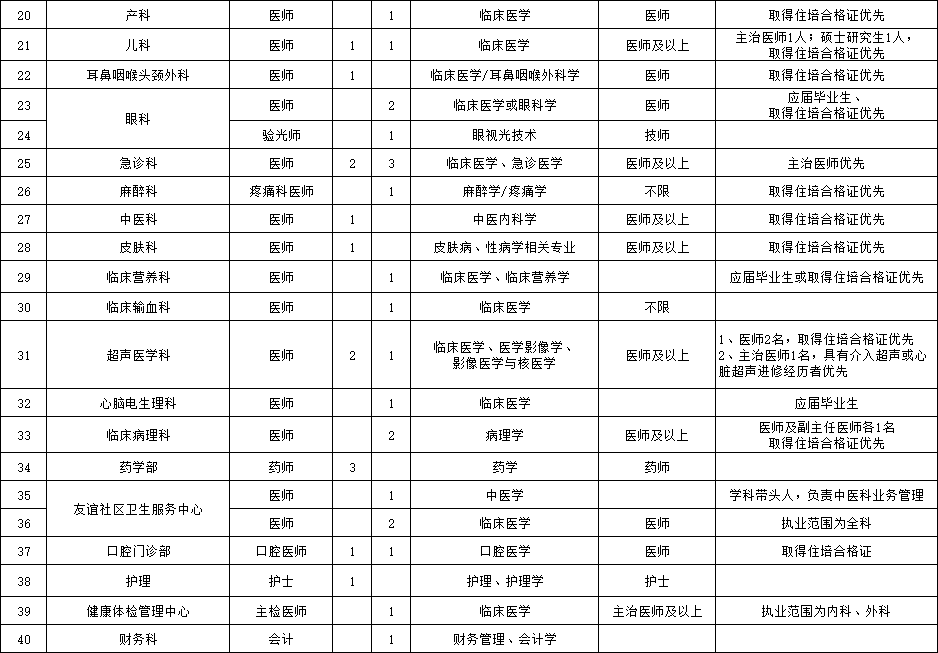 (五)應聘人員除具備以上基本條件外,還應符合招聘崗位所要求的資格條件;醫院緊缺專業((緊缺急需專業:重癥醫學科、全科醫學科、康復醫學科、感染性疾病科、急診科、兒科、麻醉科、眼科、皮膚科、病理科、心腦電生理科等)人才可適當放寬條件。