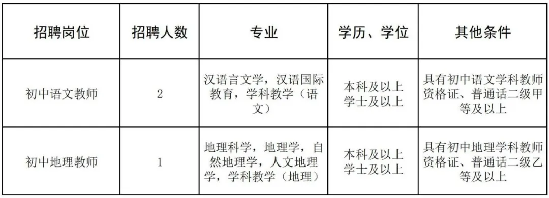 根據發展需要,學校擬招聘初中語文、初中地理頂崗教師共3人,具體招聘信息如下: