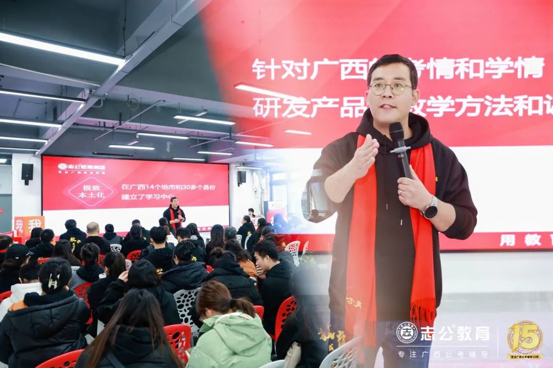 第一是極致本土化,董事長李勇表示這是志公教育集團安身立業的根本,他表示這要求對廣西公職考試響應速度要快,針對廣西的考情和學情,研發產品教學方法和課程資料,這是對教研院的考驗,明確表示未來要把錢投在學員的服務上、老師的數量、學習班主任。志公教育現在有志公教育(保稅區)全封閉基地,志公教育(中關村)全封閉基地,未來希望在桂林,柳州,百色等地也建立基地,讓志公教育在八桂大地生根,實現各美其美,美美與共。