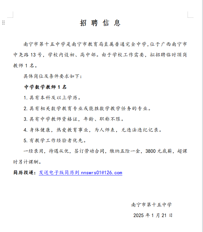 2025年南寧市第十五中學招聘中學數學老師1名