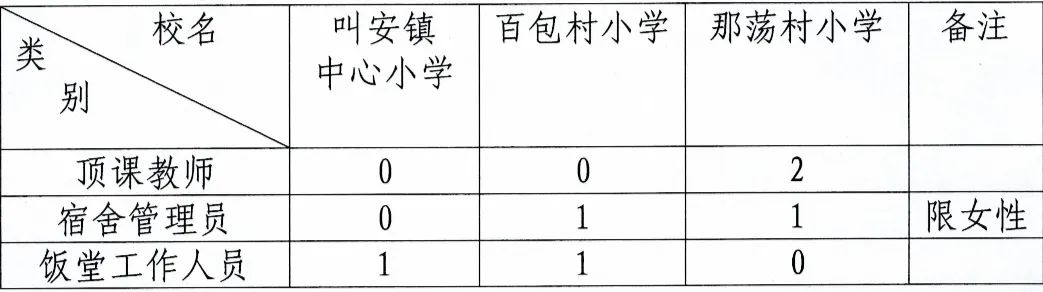 因工作需要,上思縣叫安鎮中心小學現面向社會公開招聘頂課教師、安全協管員和飯堂工作人員等。招聘相關事項如下: