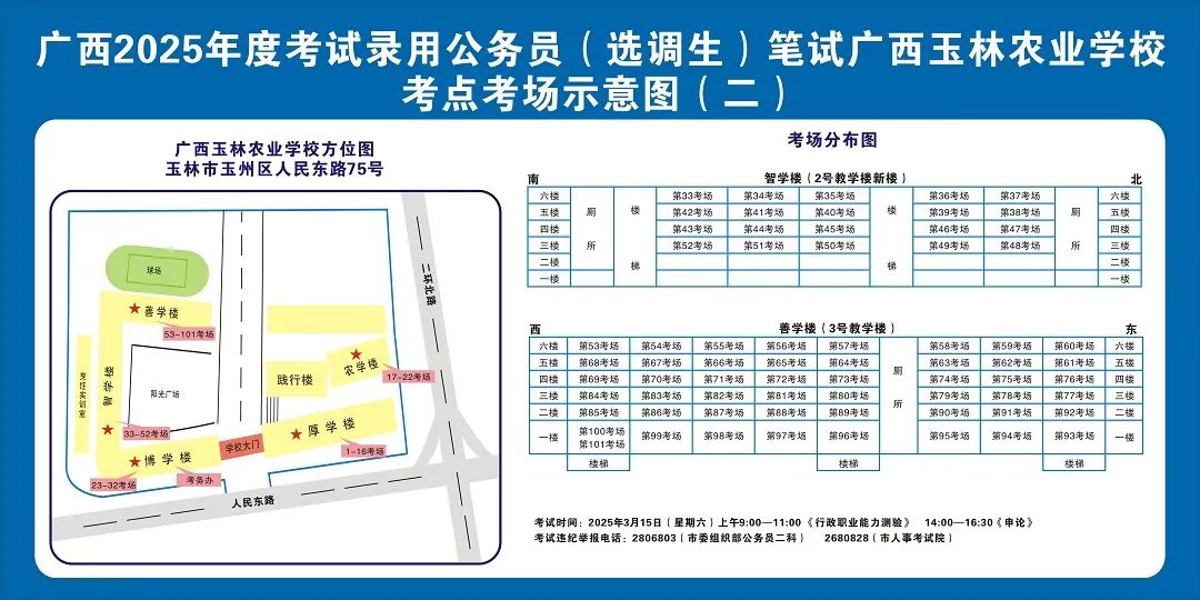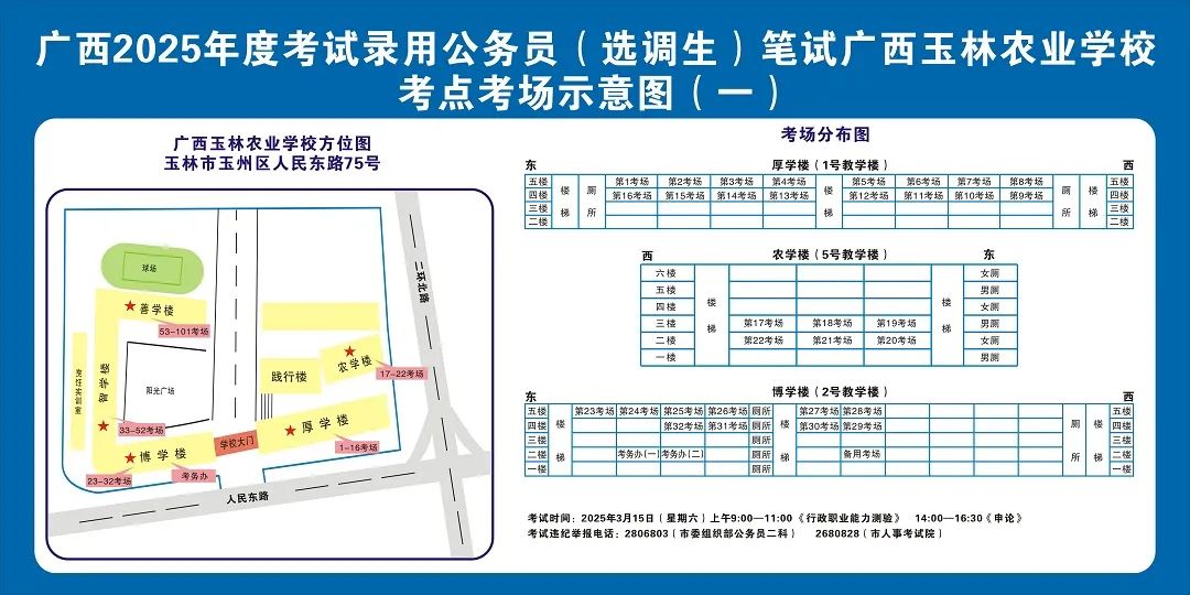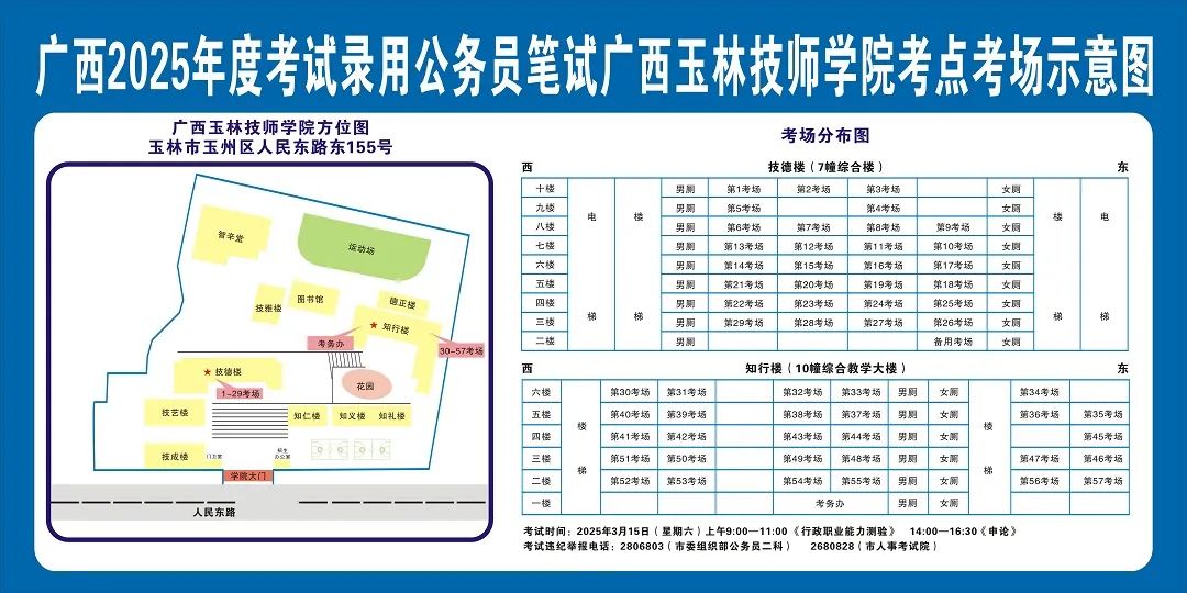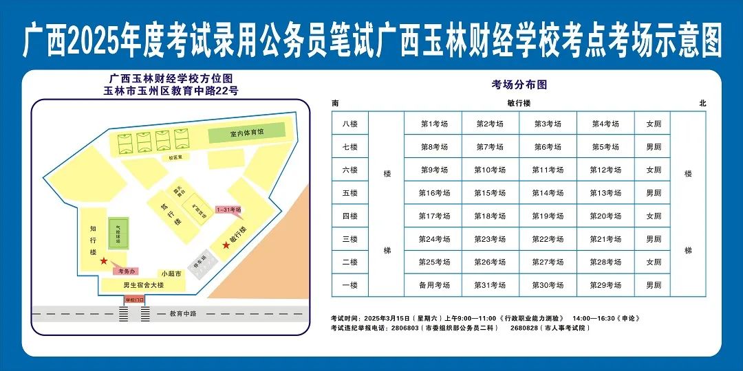 廣西2025年度考試錄用公務員(選調生)筆試將于3月15日舉行,為進一步提升玉林考區服務保障質量,現就有關注意事項提示如下,請廣大考生做好應試準備工作,準確掌握考試時間、考點地址及相關注意事項。