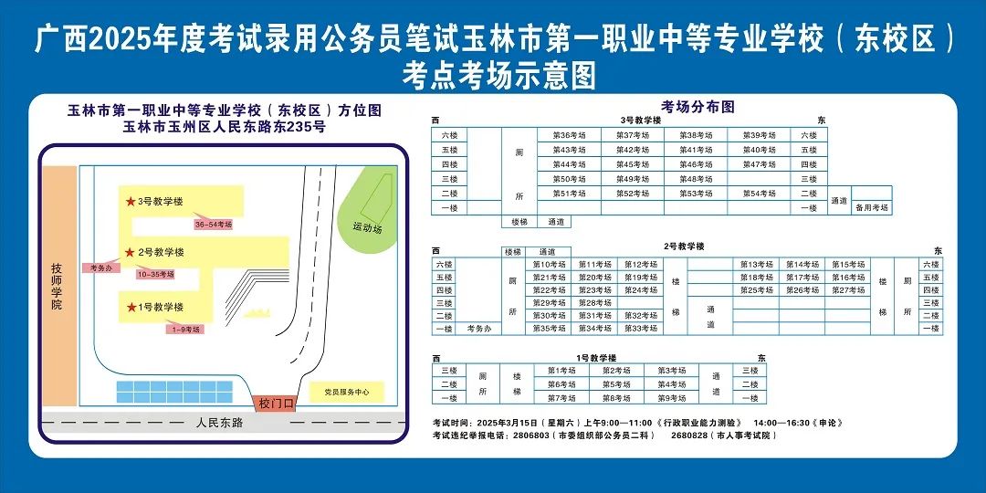 請提前了解本人所在考點具體位置,熟悉考點周邊情況,特別是考點周邊的食宿、交通情況,合理做好食宿安排和出行計劃。需要特別注意的是:玉林市第一職業中等專業學校考點是設在該校的東校區(人民東路東235號);玉林市第一中學考點是設在該校的運嶺路校區(二環北路1228號)!