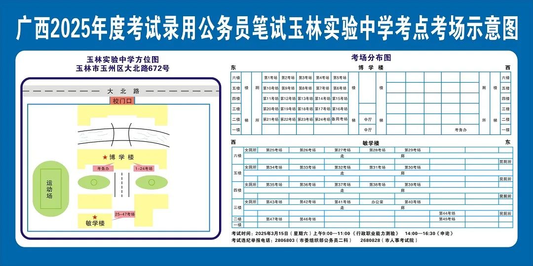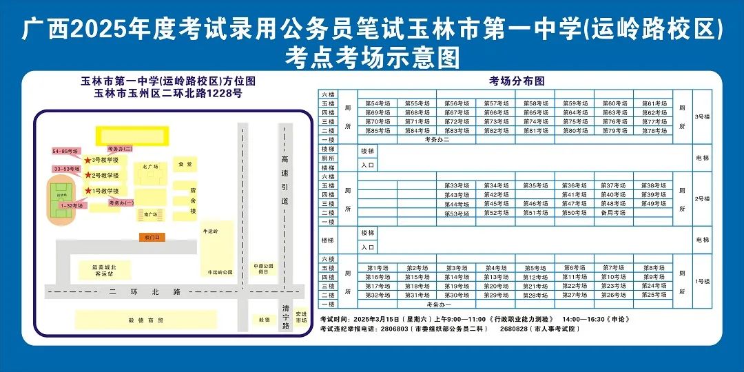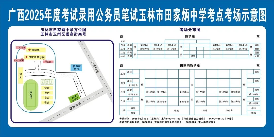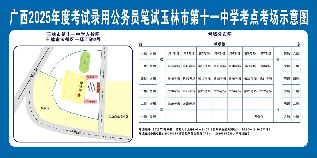 除考試當天考生可以進入考點外,考生不得提前進入考點查看考場(學校將在大門處擺放考場分布示意圖),玉林考區11個考點的考場布置情況如下: