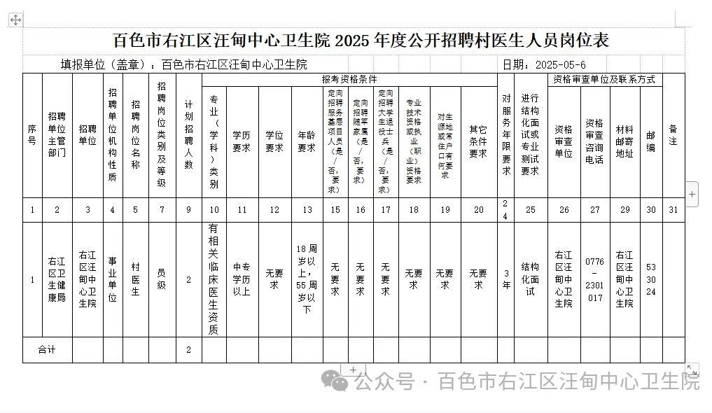3.報名地點:百色市右江區汪甸中心衛生院三樓辦公室,聯系人:林紅青 聯系電話:0776-2301017。因報名信息填寫錯漏等所造成的后果,本單位不負任何責任。