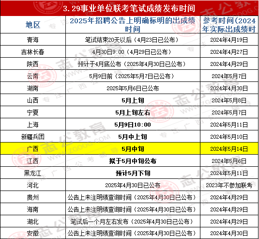 無論是青海還是貴州,或者是湖北,都是按照公告或去年出成績時間差不多的,那么2025年廣西事業單位筆試成績是否和2024年一樣為5月14日發布?