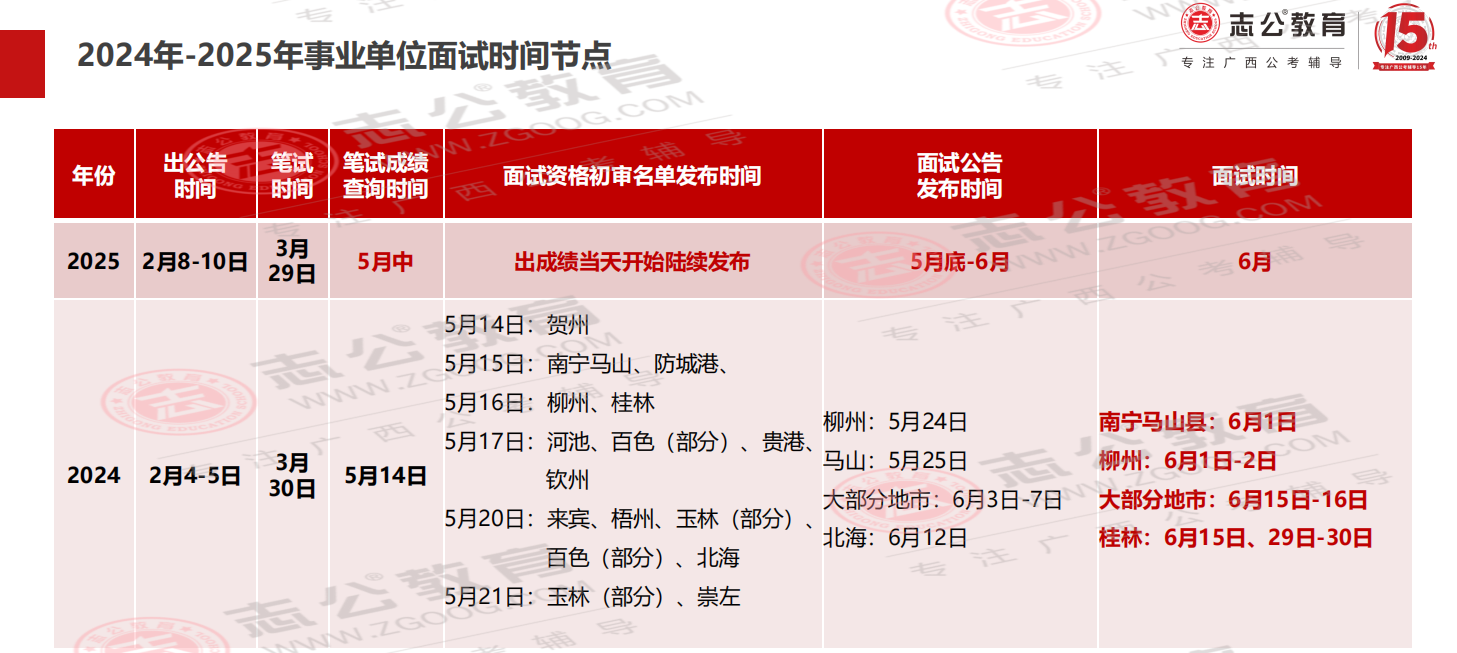 2024年廣西事業單位3月30日筆試,5月14日成績發布,最早6月1日面試,出名單到面試間隔僅2周時間備考;2025年3月29日筆試,考試周期和去年基本重合,大家可以參考去年時間,提前備考面試。