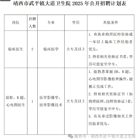 原文標題:靖西市武平鎮大道衛生院2025年公開招聘臨床醫生、影像專業技術人員公告!