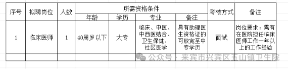 原文標題:來賓市興賓區五山鎮衛生院公開招聘編制外聘用人員公告