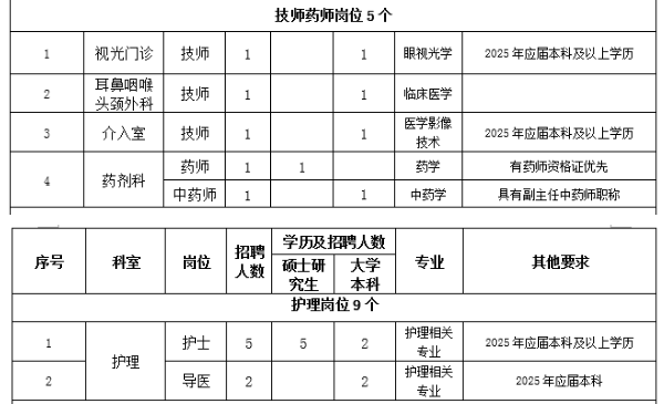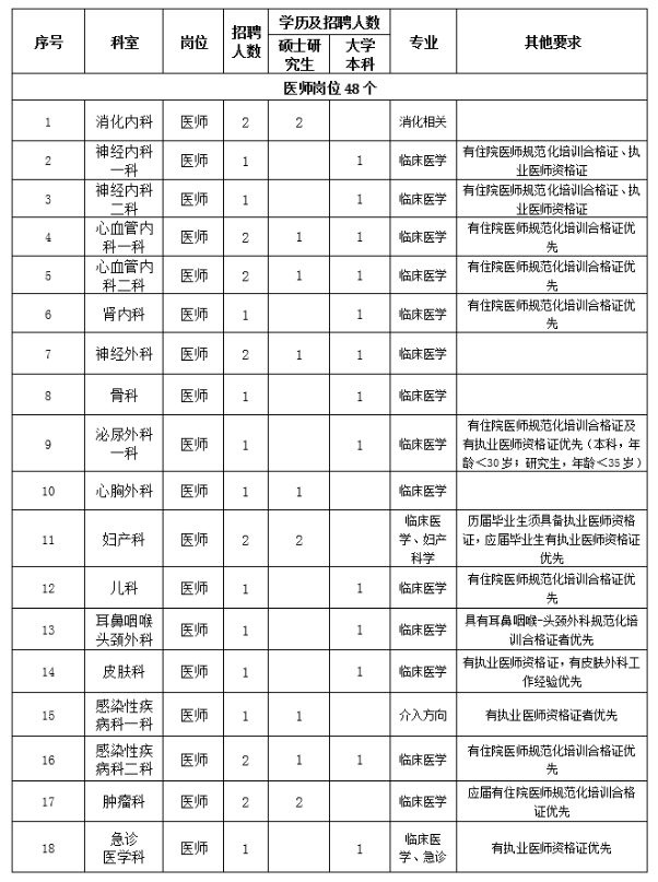 1.思想政治素質(zhì)好,擁護黨的路線、方針、政策。2.遵紀守法,醫(yī)德品行良好,有較強的事業(yè)心、責(zé)任心和進取心。3.身體健康,能滿足應(yīng)聘崗位需要。4.具備相應(yīng)的學(xué)歷和學(xué)位,有履行應(yīng)聘崗位職責(zé)的專業(yè)能力、技能條件。5.具有團隊精神,有良好的溝通能力。6.具備應(yīng)聘崗位所需要的其他條件。7.服從單位安排。