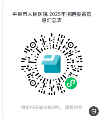 1.填寫提交紙質版《平果市人民醫(yī)院2025年度公開招聘專業(yè)技術人員報名表》(附件3),并掃描下方二維碼填寫報名信息。