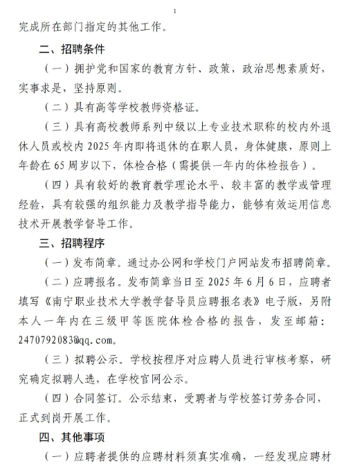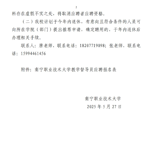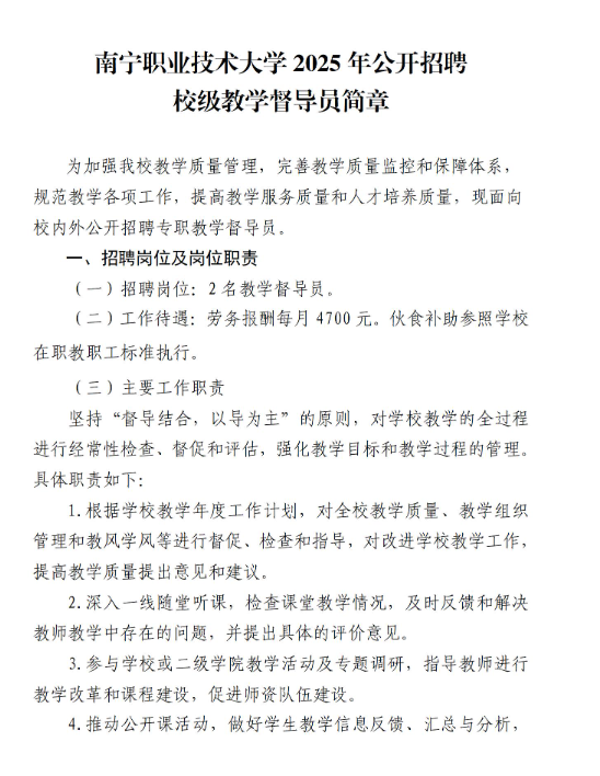 2025年廣西南寧職業技術大學招聘校級教學督導員2人