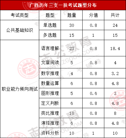 上篇我們寫到,三支一扶的待遇,在廣西這個待遇還算不錯,政策上的支持也非常好,那么預計這個月月底出公告的三支一扶,啥時候筆試呢?2024年廣西三支一扶筆試時間是7月13日,其筆試科目為《綜合知識》一科,滿分100分。基于往年考生的回憶,綜合知識內容主要包括公共基礎知識和行測職業能力測試兩個科目,而各題型的題量及分值如下圖所示: