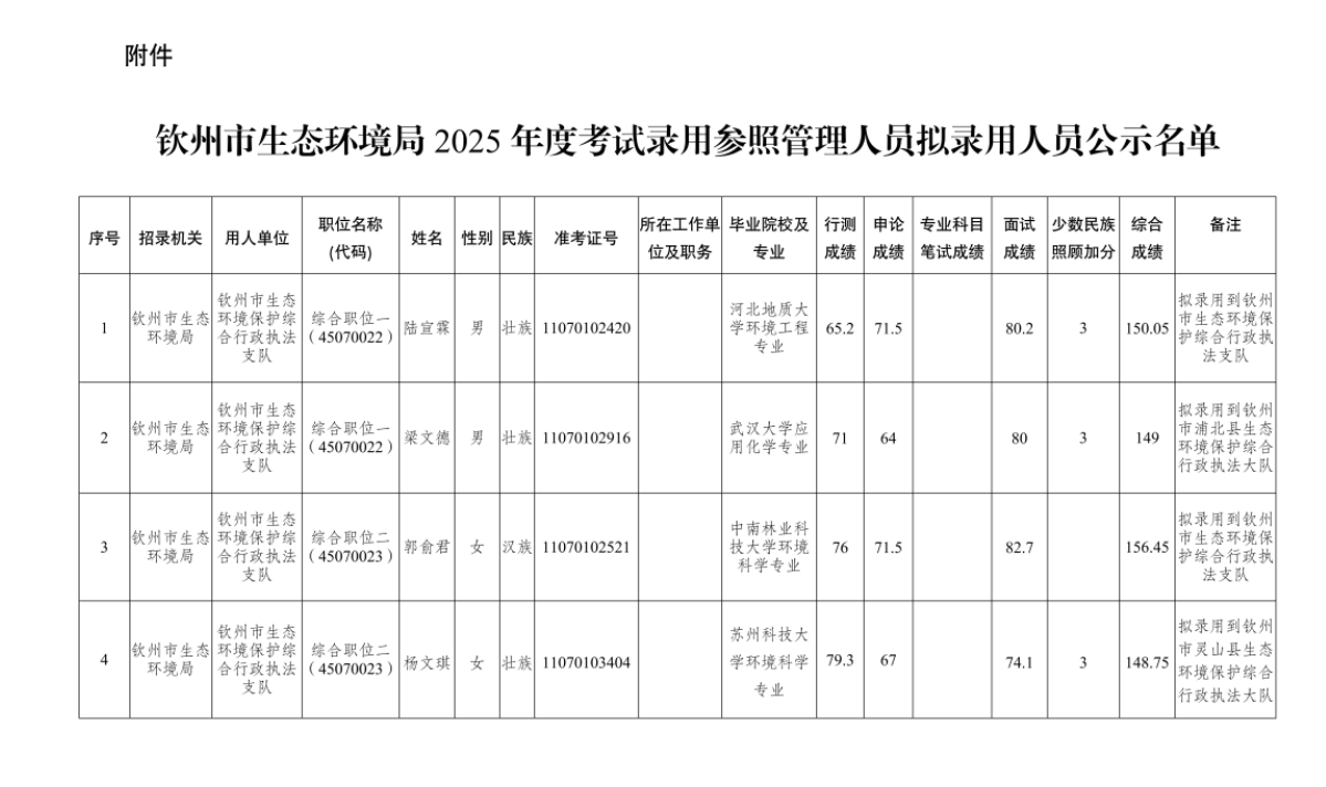 原文標題:欽州市生態環境局2025年度考試錄用參照管理人員擬錄用人員公示