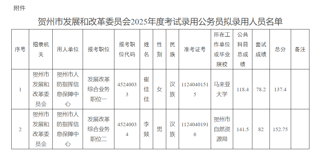 附件:賀州市發展和改革委員會2025年度考試錄用公務員擬錄用人員名單