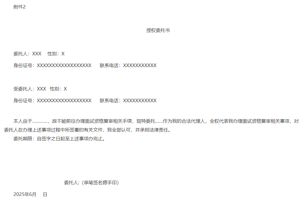 (二)面試資格復審一般應由報考人員本人參加。因特殊原因需由他人代為參加面試資格復審的,須由報考人員出具委托書(委托書應有委托人、受托人的姓名和身份證號碼,委托原因和代辦事項,委托人親筆簽名等,詳見附件2),經面試復審單位同意后,可以委托代理。