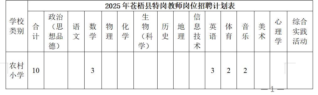 經自治區教育廳、財政廳、人社廳批準,今年我縣農村義務教育階段學校教師特設崗位計劃(以下簡稱“義教特崗”)10名,其中小學崗位10名(詳情見下表)。