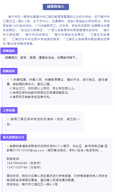 南寧市五一路學校2025年秋季學期教師招聘公告