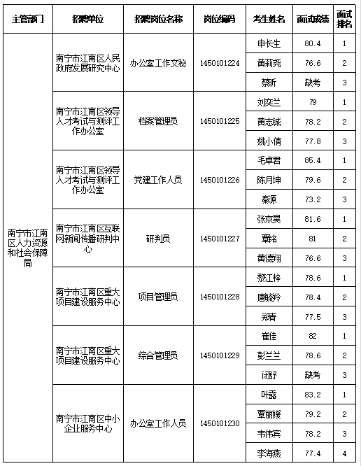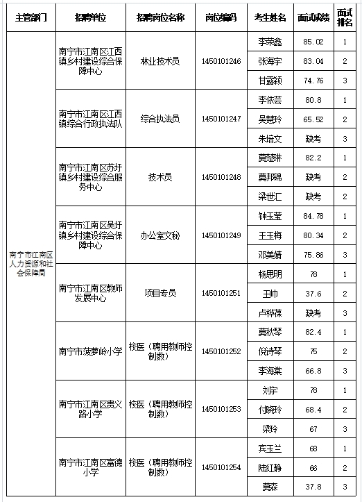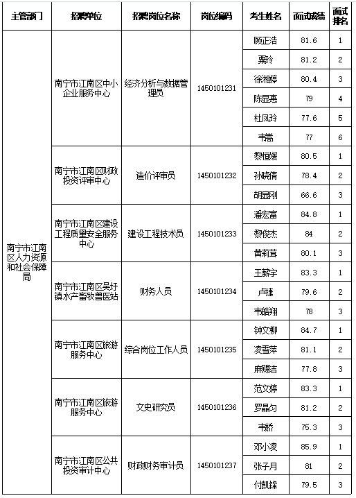原文標題:南寧市江南區人力資源和社會保障局2025年公開考試招聘事業單位工作人員面試成績表