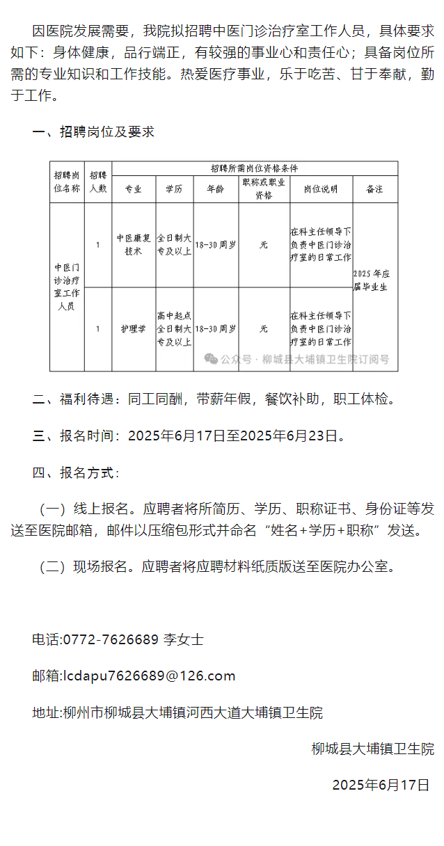 柳城縣大埔鎮衛生院中醫門診治療室工作人員招聘2人
