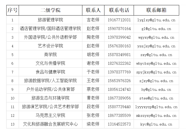 聯系地址:廣西桂林市雁山區良豐路26號桂林旅游學院人事處 郵 編:541006  聯系人:鄧老師