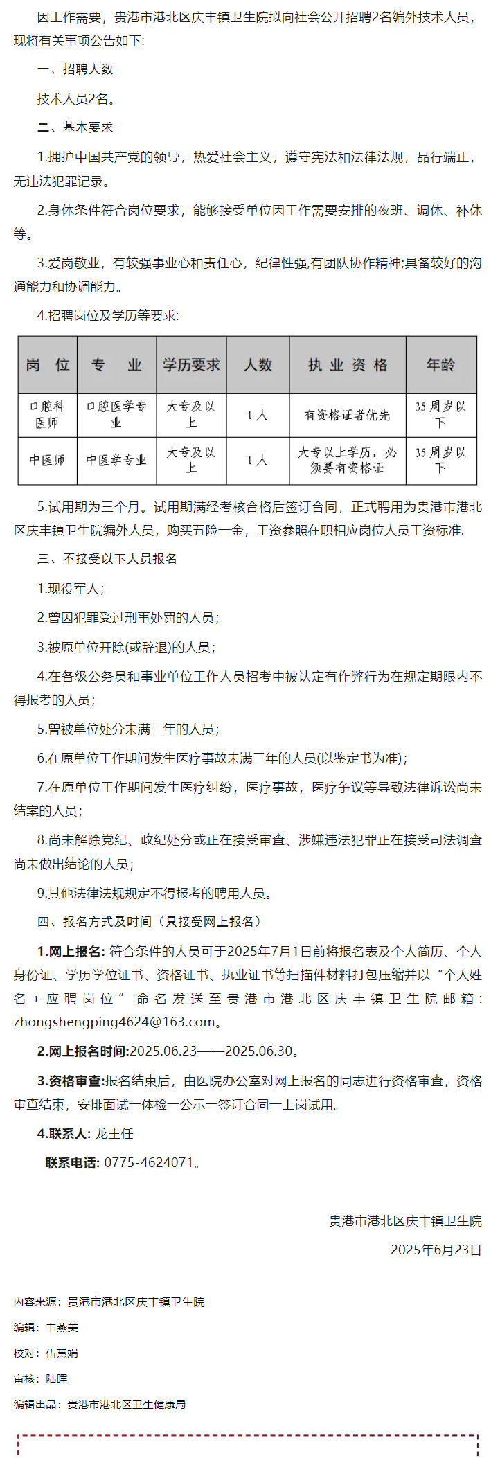2025年貴港市港北區慶豐鎮衛生院招聘編外技術人員2人