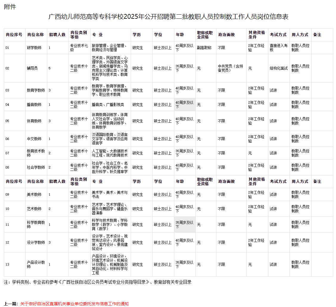 本次公開招聘工作人員26名,具體招聘崗位及要求詳見《廣西幼兒師范高等專科學校2025年公開招聘第二批教職人員控制數工作人員崗位信息表》(附件)。