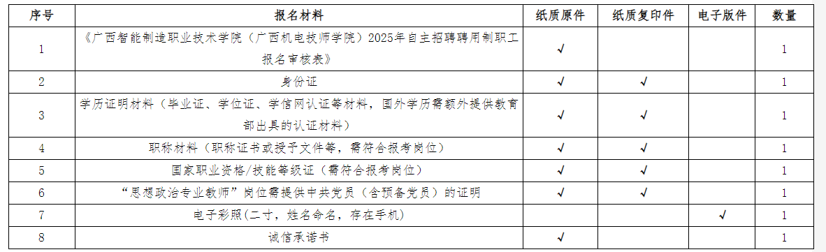 應聘者按照招聘崗位具體要求對口報名,每名應聘者限報一個崗位,采用現場報名遞交應聘材料的方式報名。報名人員須下載并填寫《廣西智能制造職業技術學院(廣西機電技師學院)2025年自主招聘聘用制職工報名審核表》(附表2),同時需附上相應的學歷、學位證書、身份證、職稱證書(相關崗位需要)等材料的原件與復印件(原件審核后退回,復印件不退回)