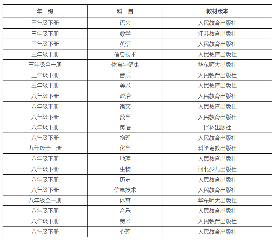 欽北區2025年春季學期使用的教材內容,小學三年級、初中八年級(化學九年級)。教材版本如下:
