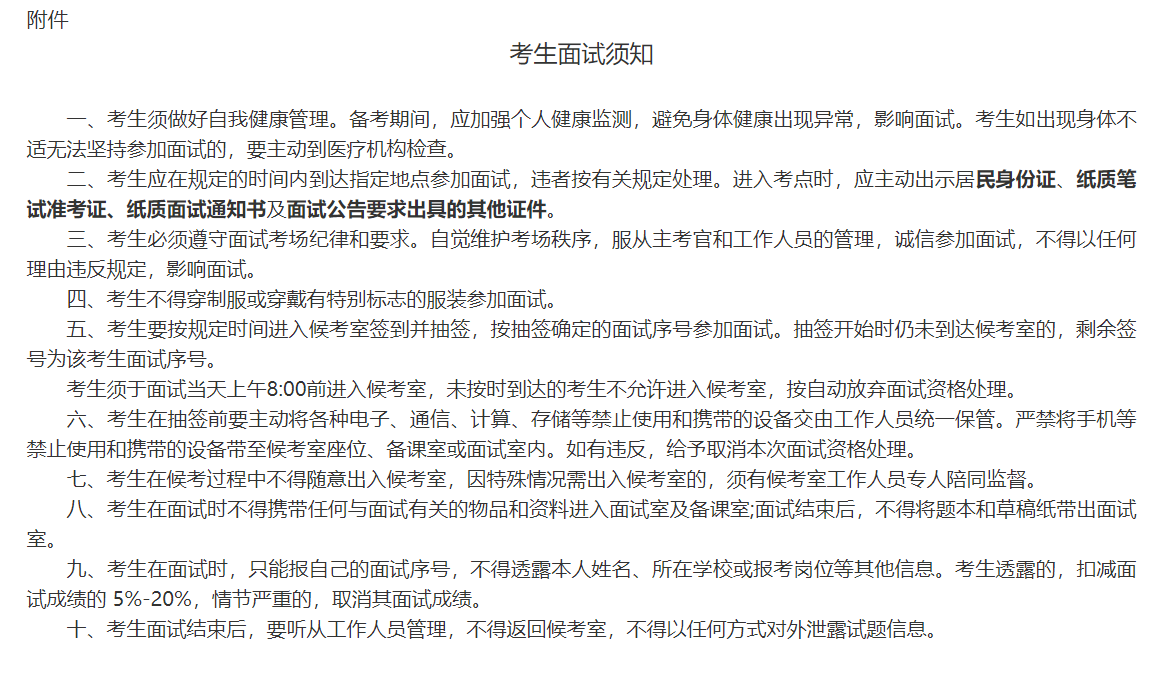 (四)考生在面試時,只能報自己的面試序號,不得透露考生姓名、所在學?;騿挝?、籍貫等信息??忌嘎兜?,扣減面試成績的5%-20%,情節嚴重的,取消其面試成績。