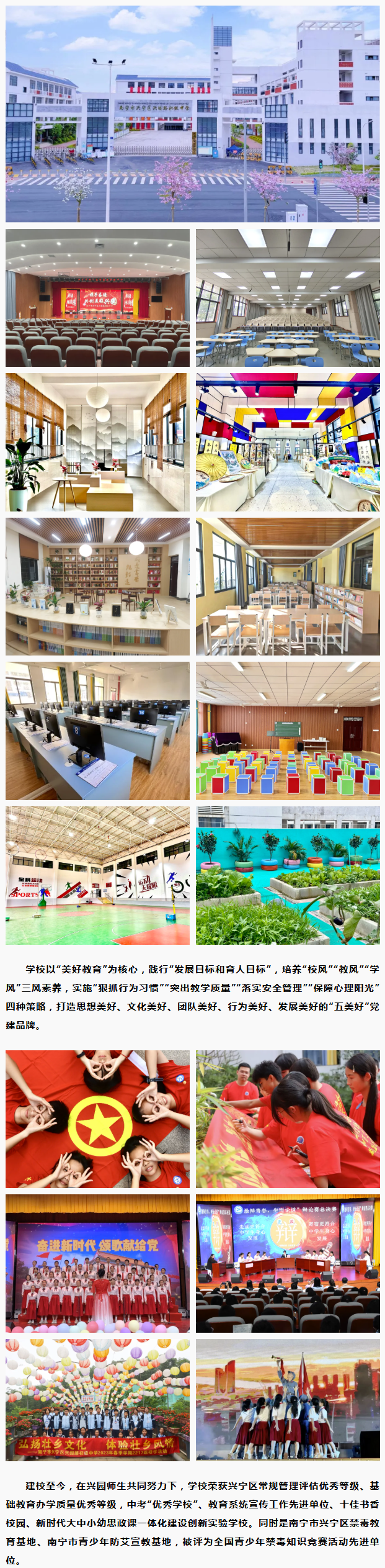 南寧市興寧區興園路初級中學2020年9月落成,于2021年9月獨立建制,是南寧市興寧區黨委、政府重點打造的一所現代化公辦初級中學,是興寧區教育領域中一個備受矚目、冉冉升起的教育明星!學校占地95畝,總建筑面積28241平方米,建設規模60個教學班,現在崗教職工200多人。教育教學設施齊全精良:室內體育館、標準田徑場、大型活動報告廳、多媒體教室、賽課室、錄課室、校園電臺、各學科功能室和實驗室等。