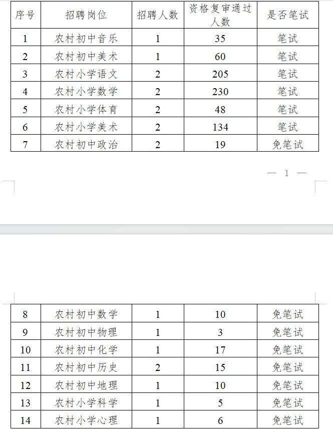 根據《桂林市雁山區2025年特崗教師招聘公告》要求“筆試按實際通過資格復審人數開考;招聘崗位資格復審通過人數不足20人免筆試,資格復審通過人數20人以上(含20人,研究生及以上學歷不包含在內,研究生及以上學歷免筆試),需進行筆試。”經現場資格復審,桂林市雁山區2025年特崗教師招聘筆試、免筆試學科崗位情況如下: