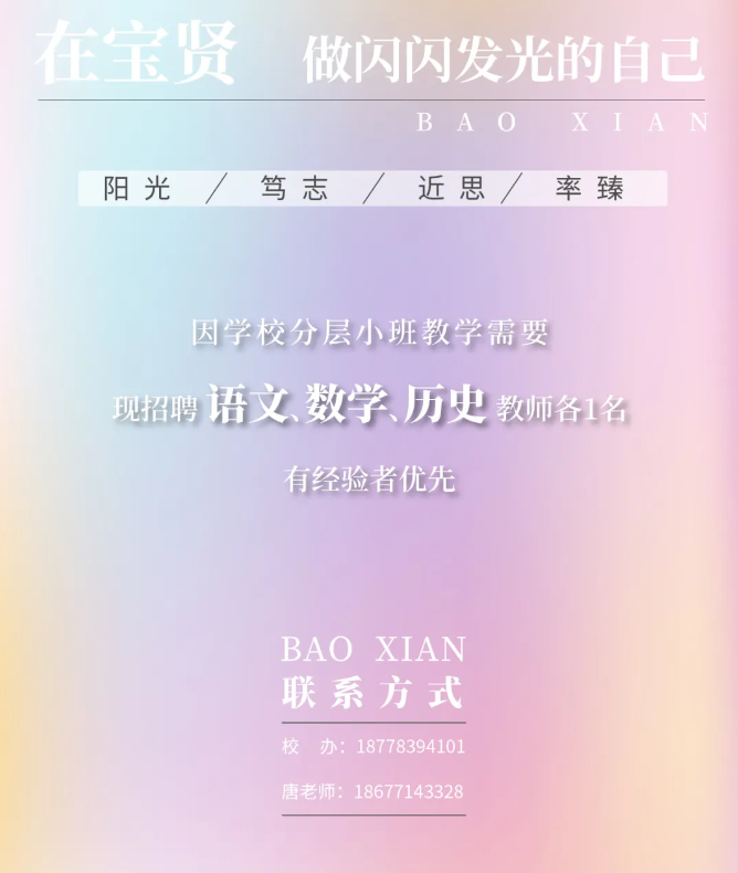 4.取得初級中學以上教師資格證,具有良好的身體和心理素質,體檢符合教師資格認定標準,對教育有理想追求,理解并愿意踐行桂林市疊彩區寶賢學校辦學理念。