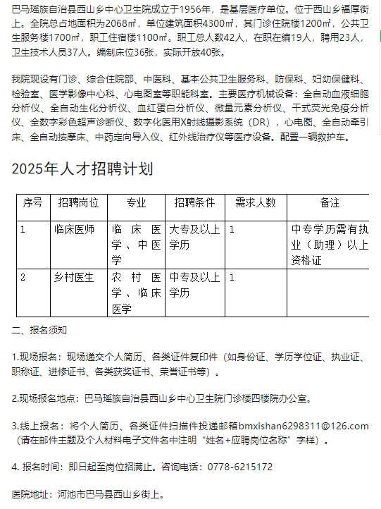 2025年巴馬瑤族自治縣西山鄉中心衛生院人才招聘