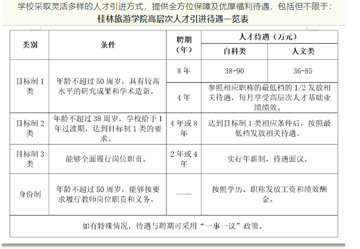 4.根據自治區政府文件要求,符合相應條件者,學校積極配合申請廣西壯族自治區高層次人才認定和各類人才項目,若入選可享受各類優厚的人才待遇,詳情請登錄廣西高層次人才“一站式”服務平臺(http://www.gxrc.org/)查閱。首次來桂工作的35歲以下、具有博士學位的青年人才,可按照政策申領自治區青苗人才普惠性支持。如入選桂林市高層次人才,還可以享受桂林市高層次人才有關津貼、購房補貼和個稅獎勵等人才補助。詳見桂林市高層次人才一站式服務平臺(https://gcc.glrcw.com/)。