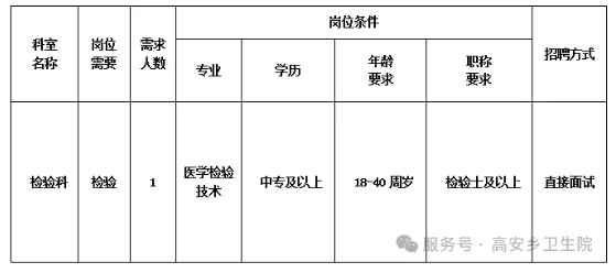來賓市興賓區高安鄉衛生院是一家集醫療、預防保健、康復醫療于一體的國家公立基層醫療機構,現有職工45人,服務人口約2萬人。因工作需要,我院擬向社會公開招聘編制限額外檢驗科人員1名,現將有關招聘事項公告如下: