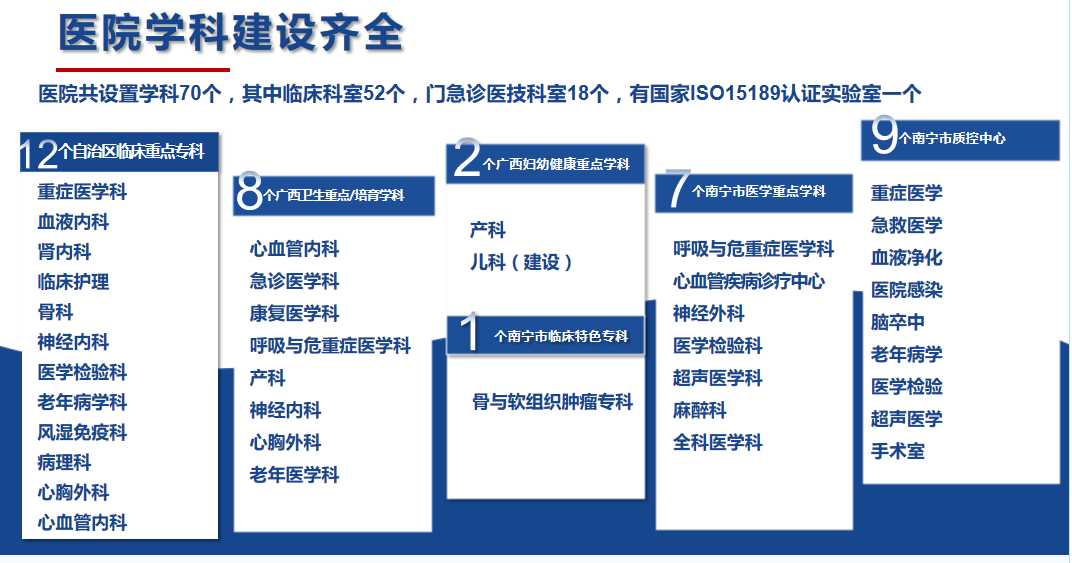 南寧市第一人民醫院(南寧市兒童先天性心血管疾病研究所、南寧市呼吸道疾病研究所、廣西醫科大學第五臨床醫學院、廣西醫科大學第五附屬醫院)始建于1914年,是一家擁有百年歷史的國家三級甲等綜合性醫院。醫院設有52個臨床病區,18個門診醫技科室,總開放床位1912張(含分院)。醫院是國家高級認知中心建設單位及國家神經介入建設中心、國家ISO15189醫學檢驗認證機構,國家聯盟中心認證的胸痛中心、卒中中心;擁有廣西臨床重點??疲ê嘤?2個、自治區醫療衛生重點學科(含培育)8個、自治區婦幼健康服務重點學科(含建設)2個、南寧市醫學重點學科7個、南寧市臨床特色優勢???個,南寧市質控中心9個。醫院是國家衛健委創面修復能力建設和繼續教育中心教學基地、國家級住院醫師規范化培訓培訓基地,廣西醫科大學碩士研究生培養基地,同時是暨南大學共建醫學教育基地、第十批廣西博士后創新實踐基地;醫院還具備國家藥物臨床試驗機構資質(含I期研究室);醫院醫學實驗中心獲批廣西科技廳重點實驗室“廣西智慧精準醫學實驗室”,是南寧市衛健系統唯一的省級重點建設實驗室。2019年在市委市政府支持下,成立南寧市第一人民醫院醫療集團。現有27家成員單位,形成“1+4+22”(中心醫院+4家二級醫院+22家基層衛生及養老機構)一體化格局,推行“三二一”運營管理模式,逐步構建全生命周期健康管理鏈。