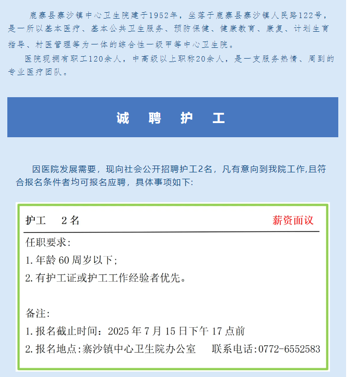 原文標題:鹿寨縣寨沙鎮中心衛生院2025年公開招聘護工公告