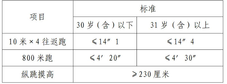 體能測評項目中,縱跳摸高的測試次數不超過3次,10米×4往返跑測評次數為2次,1000米/800米的測評次數均為1次。應聘勤務崗位的人員,體能測評三項全部達標的方為合格;應聘文職崗位的人員,體能測評三項有兩項達標的,視為合格。