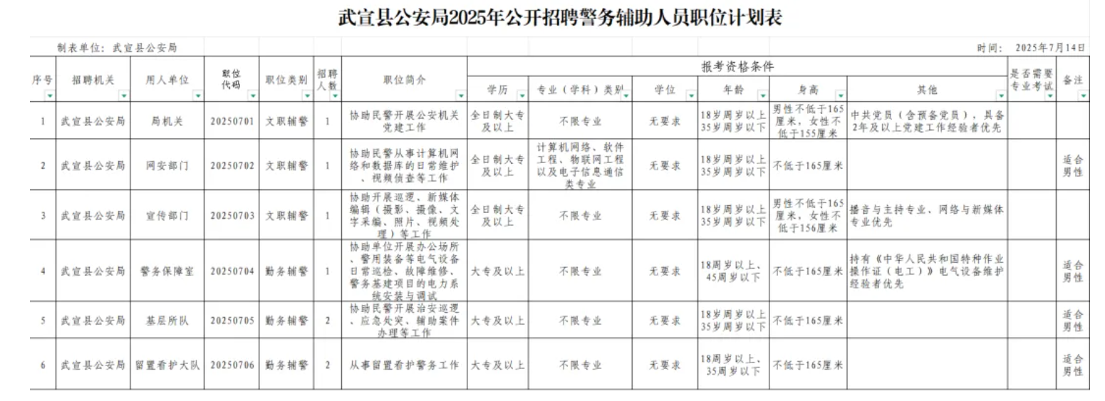 招聘人數:8人,詳見《武宣縣公安局2025年第二次面向社會招聘輔警職位計劃表》(附件1)。