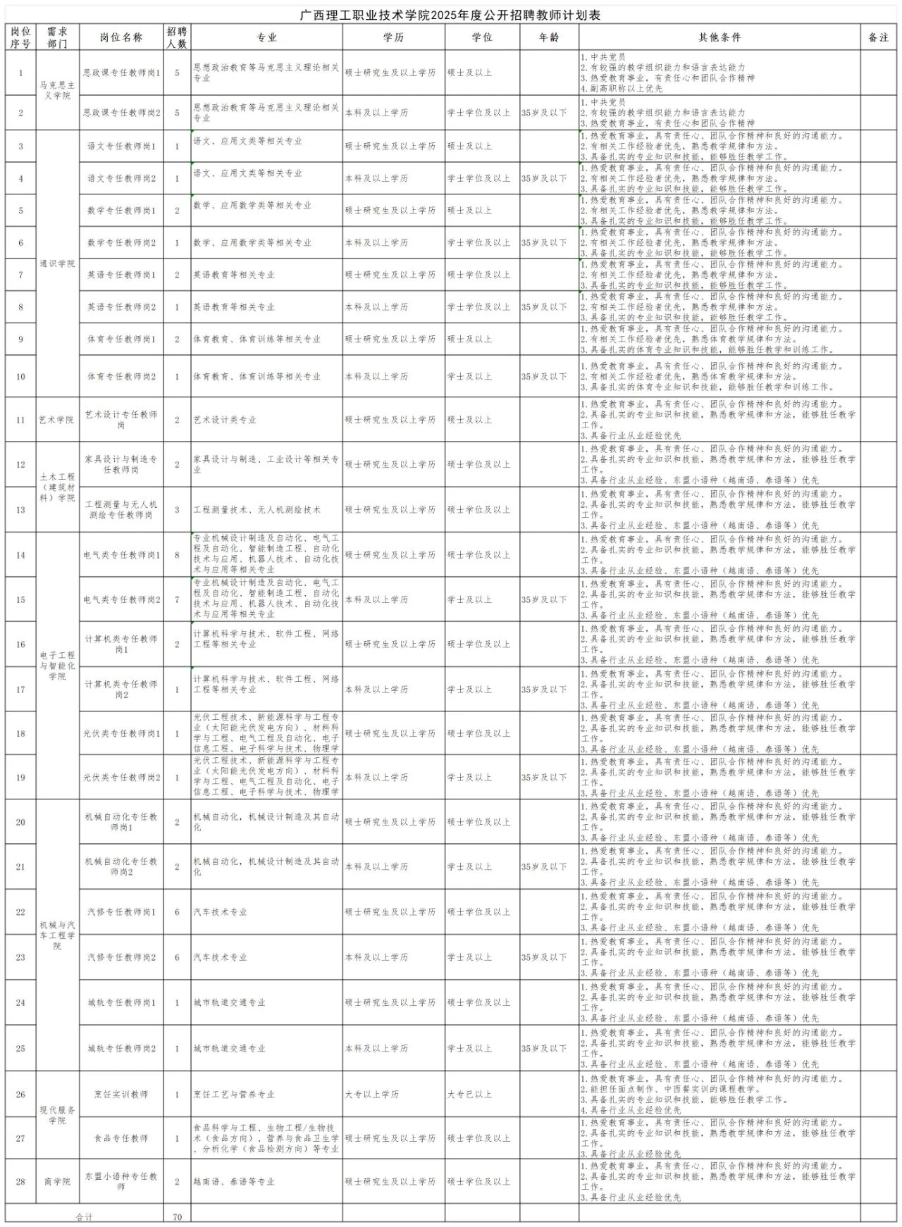 詳見《廣西理工職業技術學院2025年度公開招聘教師計劃表》