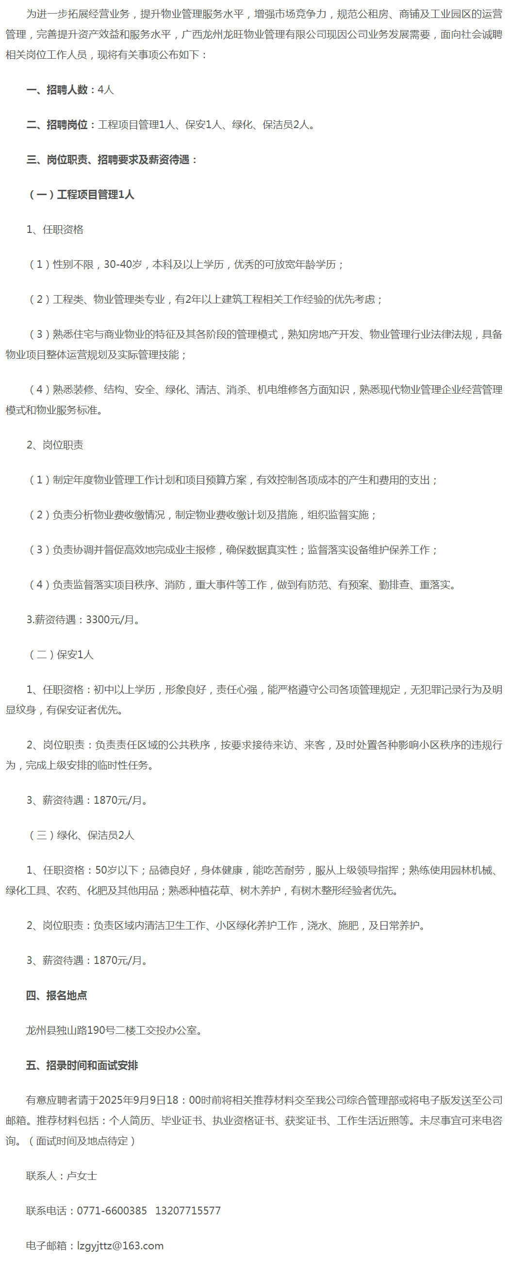 2025年廣西龍州龍旺物業管理有限公司招聘公告
