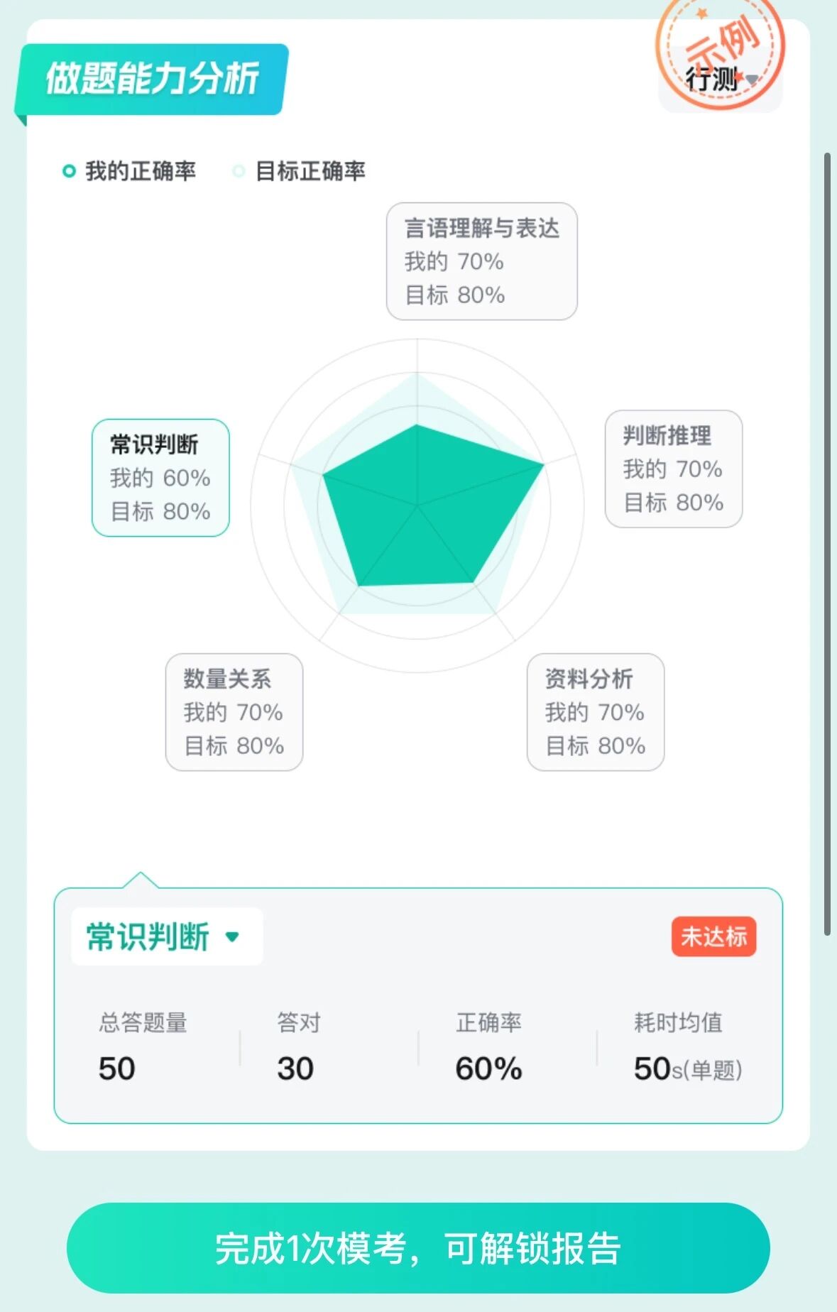 3??生成個人模考報告:考完就能查看模考成績、排名及解析,生成的個人模考報告包含各模塊正確率分布、做題能力分析、筆試分數yu測等內容。