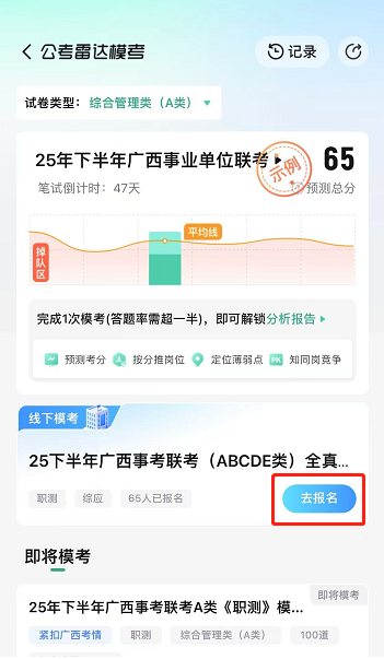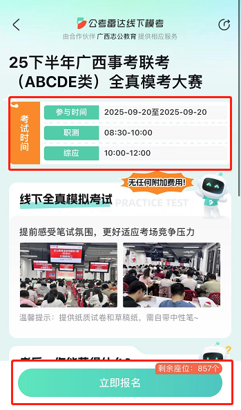 1??全zhen模擬高度還原:嚴格按照廣西事業單位聯考流程和時間進行,試卷對標zhen題,考場安排也高度還原,給你沉浸式考試體驗。
