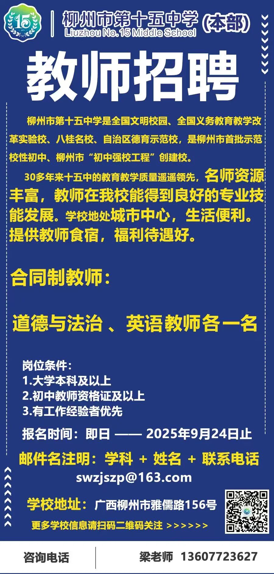 2025年柳州市第十五中學本部招聘公告