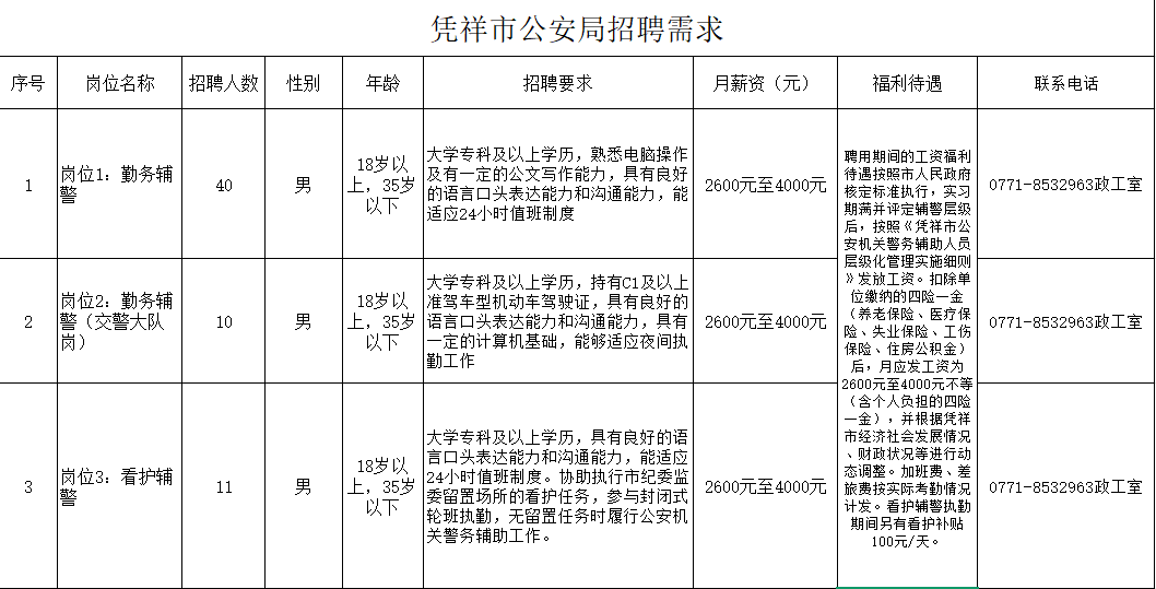 為適應憑祥市公安機關管理工作發展需要,憑祥市公安局決定面向社會公開招聘61名警務輔助人員(以下簡稱輔警)。具體事宜如下: