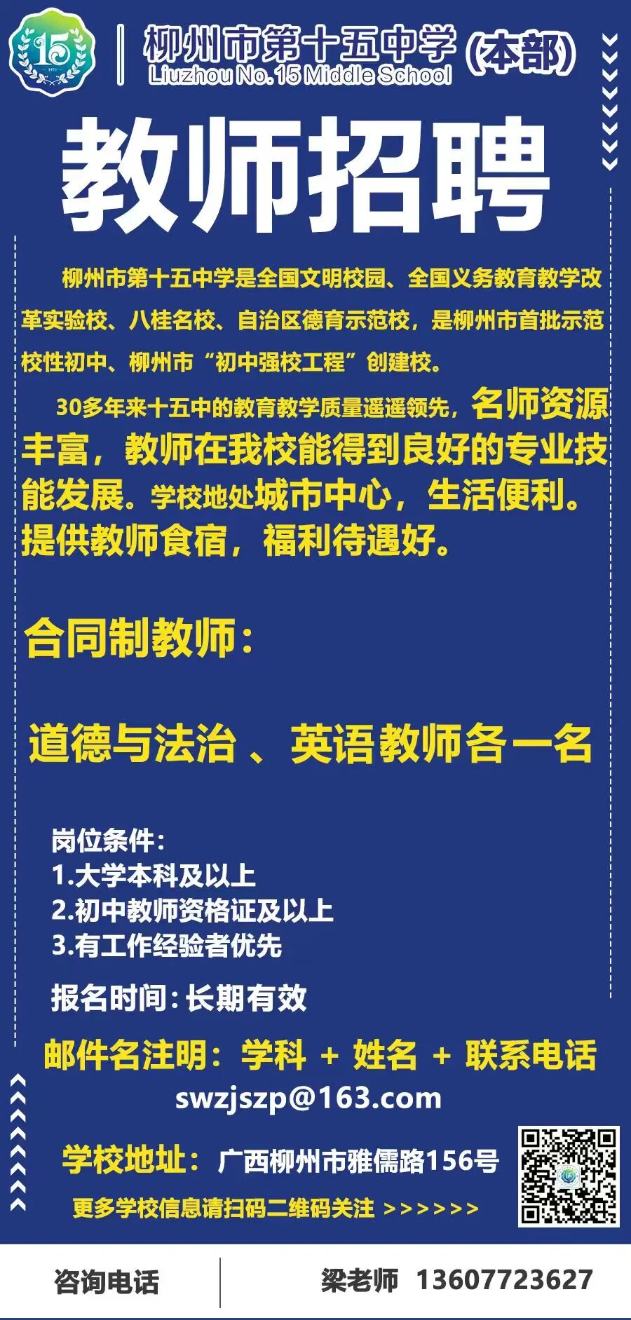 原文標題:柳州市第十五中學本部招聘公告